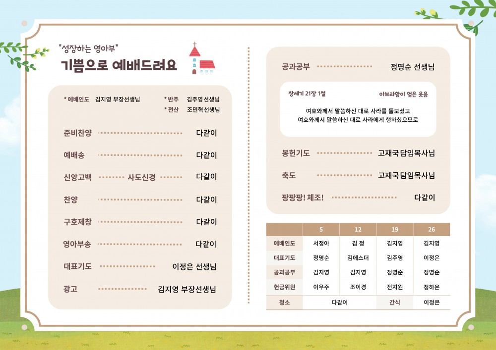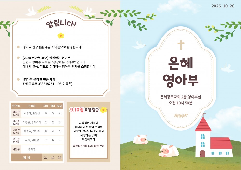 목록 [주 보] 251026 은혜교회 영아부 주보 작성자 영아부 작성일 25-10-26 11:52 | 조회 35 | 댓글 0 본문 251026 은혜교회 영아부 주보입니다~^^ 이전글다음글 댓글목록 등록된 댓글이 없습니다. 목록