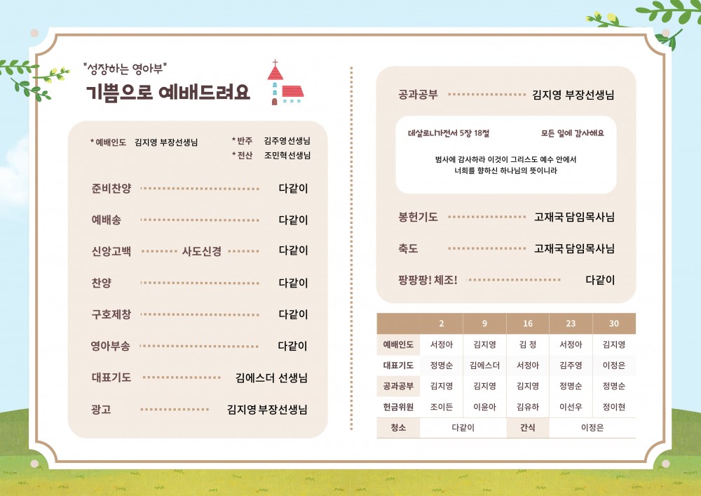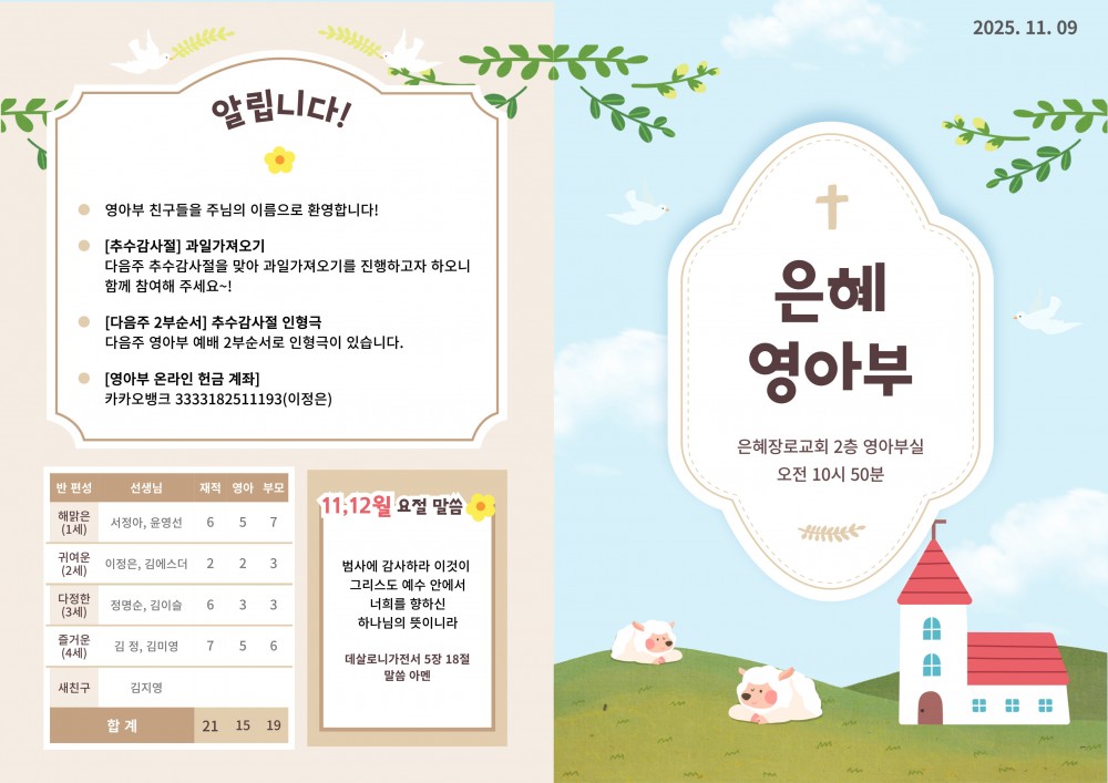 목록 [주 보] 251109 은혜교회 영아부 주보 작성자 영아부 작성일 25-11-09 12:37 | 조회 1 | 댓글 0 본문 251109 은혜교회 영아부 주보 다음글 댓글목록 등록된 댓글이 없습니다. 목록