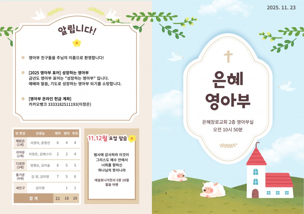 목록 [주 보] 251123 은혜교회 영아부 주보 작성자 영아부 작성일 25-11-23 10:41 | 조회 42 | 댓글 0 본문 251123 영아부 주보입니다~ 이전글다음글 댓글목록 등록된 댓글이 없습니다. 목록