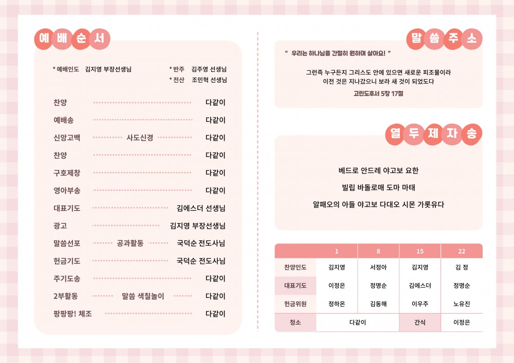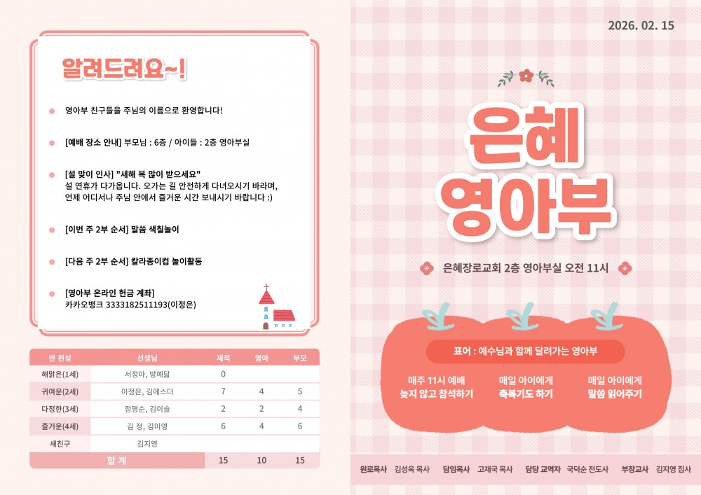 목록 [주 보] 260215 은혜교회 영아부 주보 작성자 영아부 작성일 26-02-15 10:37 | 조회 49 | 댓글 0 본문 260215 은혜교회 영아부 주보 입니다~! 이전글다음글 댓글목록 등록된 댓글이 없습니다. 목록