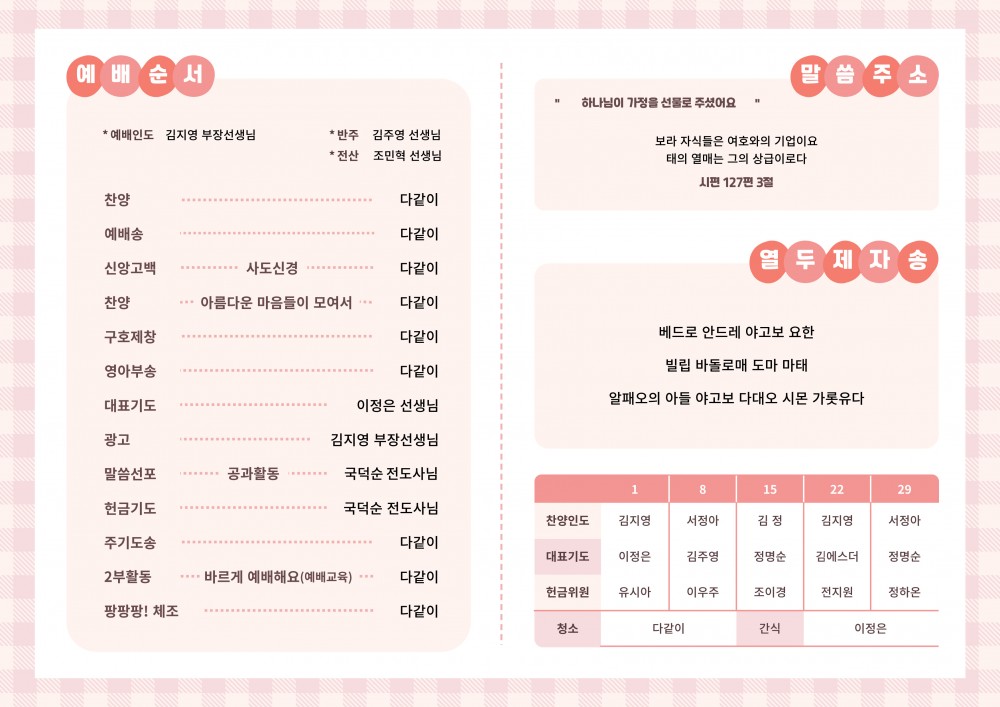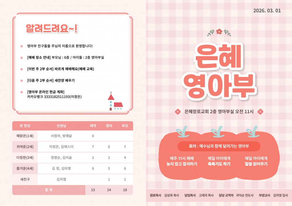 목록 [주 보] 260301 은혜교회 영아부 주보 작성자 영아부 작성일 26-03-01 10:30 | 조회 35 | 댓글 0 본문 260301 은혜교회 영아부 주보입니다~! 이전글다음글 댓글목록 등록된 댓글이 없습니다. 목록