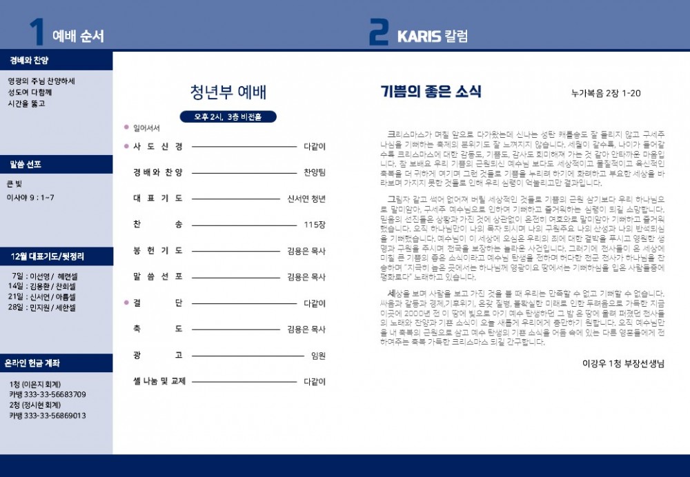 목록 [2청년주보] [카리스예배] 25.12.21 주보 작성자 청년부 작성일 25-12-21 07:44 | 조회 1 | 댓글 0 본문 2025.12.21 카리스 주보입니다. 다음글 댓글목록 등록된 댓글이 없습니다. 목록