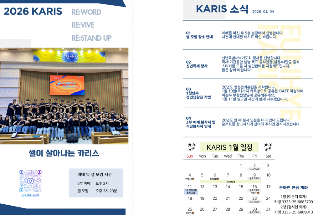 목록 [2청년소식] [카리스 소식] 2026.01.04 소식지 작성자 청년부 작성일 26-01-04 17:19 | 조회 67 | 댓글 0 본문 2026.01.04 카리스 소식 알려드립니다. 이전글다음글 댓글목록 등록된 댓글이 없습니다. 목록
