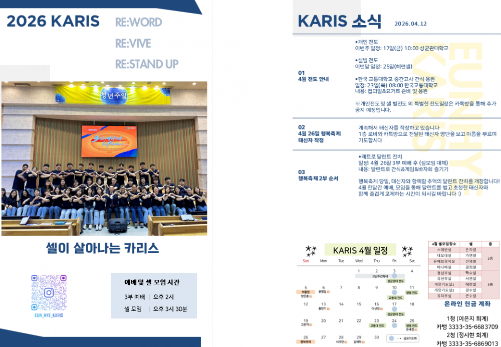 목록 [2청년소식] [카리스 소식] 2026.04.12 소식지 작성자 청년부 작성일 26-04-12 13:15 | 조회 40 | 댓글 0 본문 2026.04.12 카리스 소식 알려드립니다. 이전글다음글 댓글목록 등록된 댓글이 없습니다. 목록