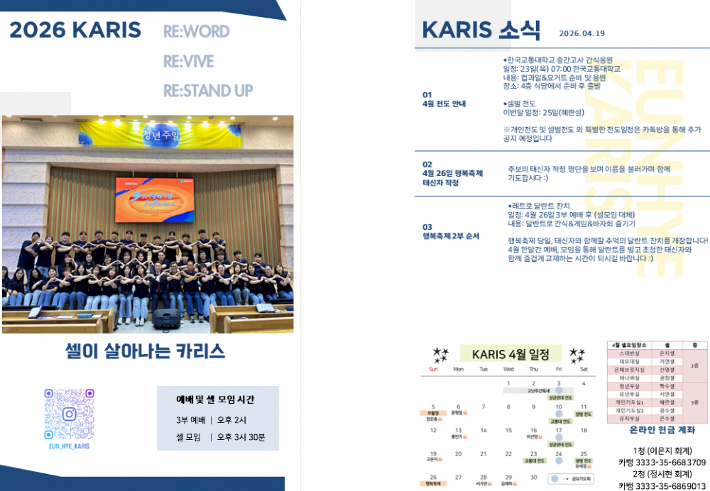 목록 [2청년소식] [카리스 소식] 2026.04.19 소식지 작성자 청년부 작성일 26-04-19 13:09 | 조회 19 | 댓글 0 본문 2026.04.19 카리스 소식 알려드립니다. 다음글 댓글목록 등록된 댓글이 없습니다. 목록
