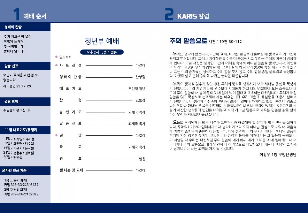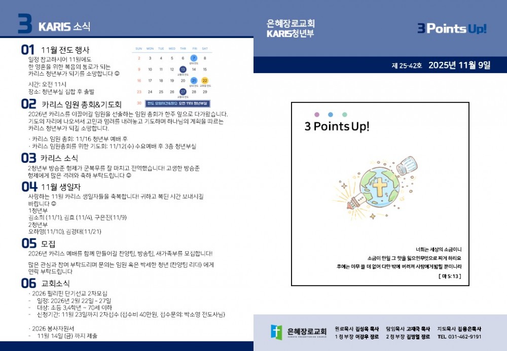 목록 [1청년주보] [카리스예배] 25.11.09 주보 작성자 청년부 작성일 25-11-13 10:24 | 조회 1 | 댓글 0 본문 25.11.09 카리스 주보입니다 다음글 댓글목록 등록된 댓글이 없습니다. 목록