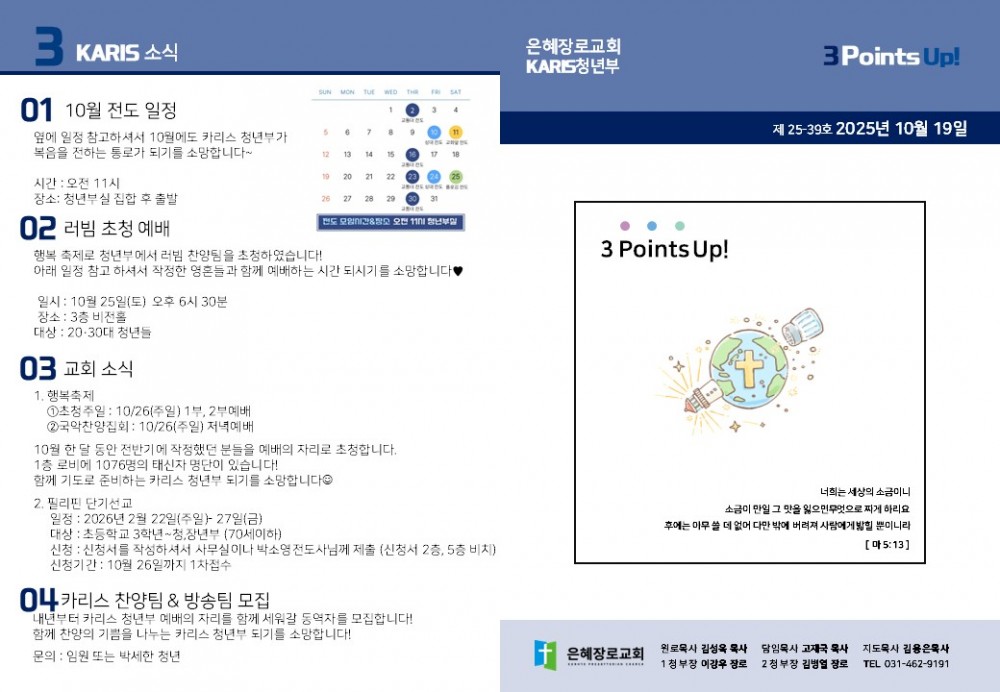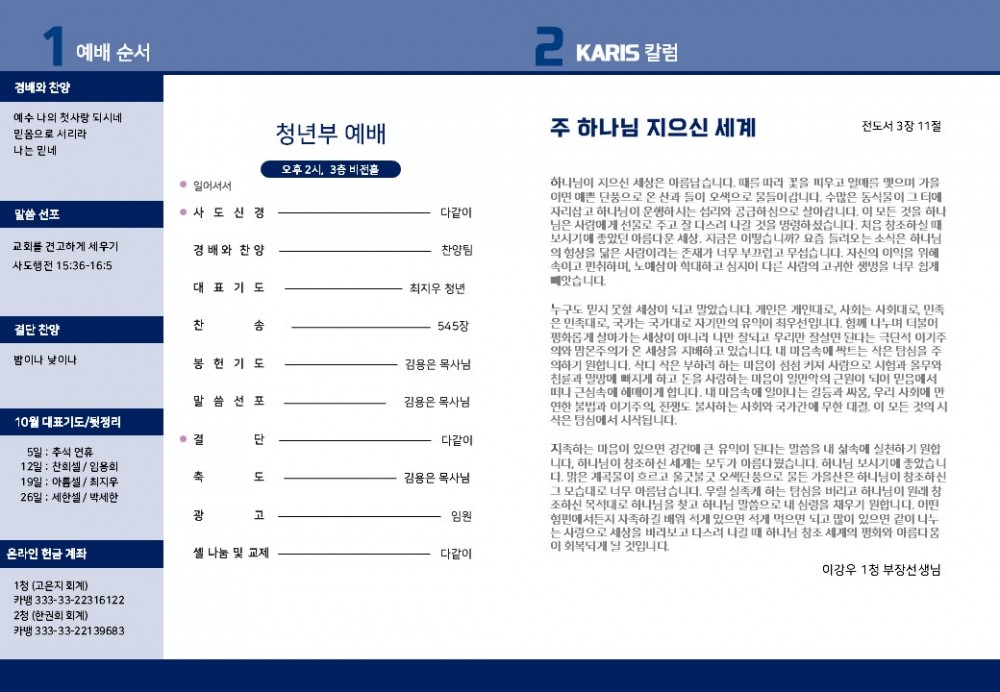목록 [1청년주보] [카리스예배] 25.10.19 주보 작성자 청년부 작성일 25-10-19 16:02 | 조회 52 | 댓글 0 본문 25.10.19 카리스 주보입니다 이전글다음글 댓글목록 등록된 댓글이 없습니다. 목록
