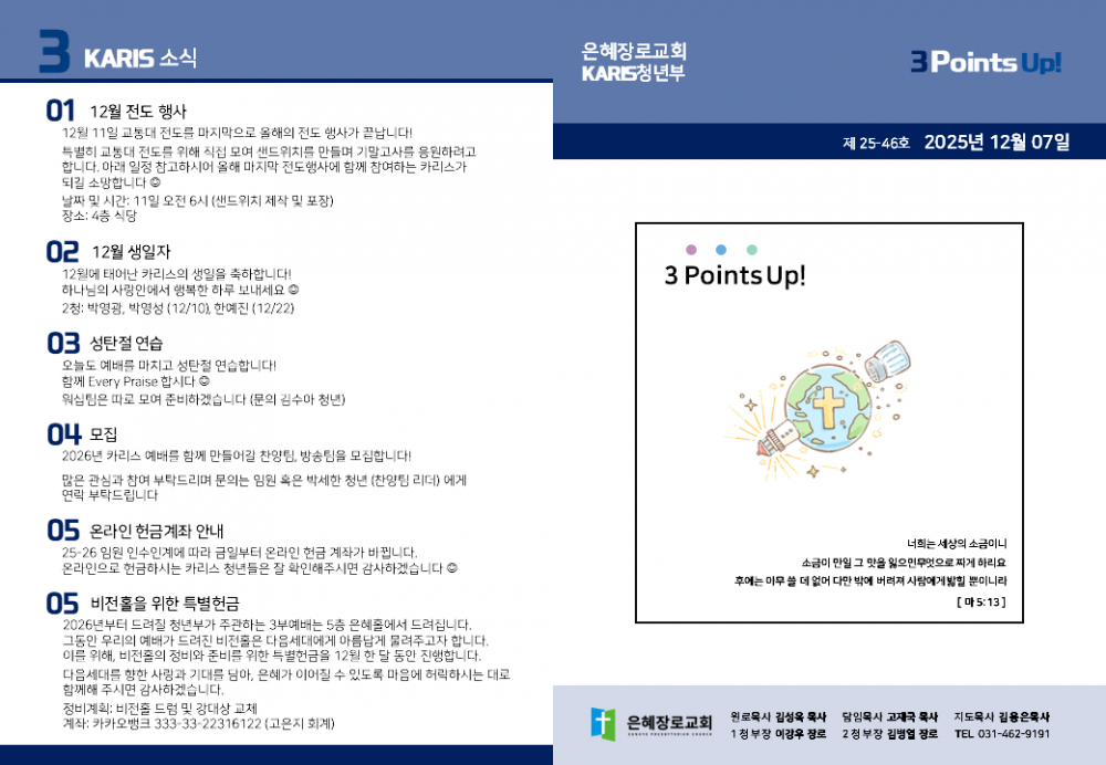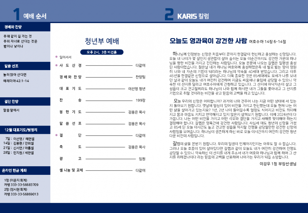 목록 [1청년주보] [카리스예배] 25.12.07 주보 작성자 청년부 작성일 25-12-07 18:05 | 조회 41 | 댓글 0 본문 2025.12.07 카리스 주보입니다. 이전글다음글 댓글목록 등록된 댓글이 없습니다. 목록