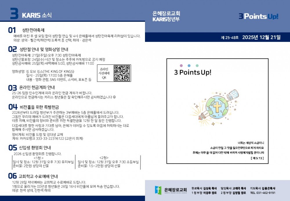 목록 [1청년주보] [카리스예배] 25.12.21 주보 작성자 청년부 작성일 25-12-21 07:45 | 조회 2 | 댓글 0 본문 2025.12.21 카리스 주보입니다. 다음글 댓글목록 등록된 댓글이 없습니다. 목록