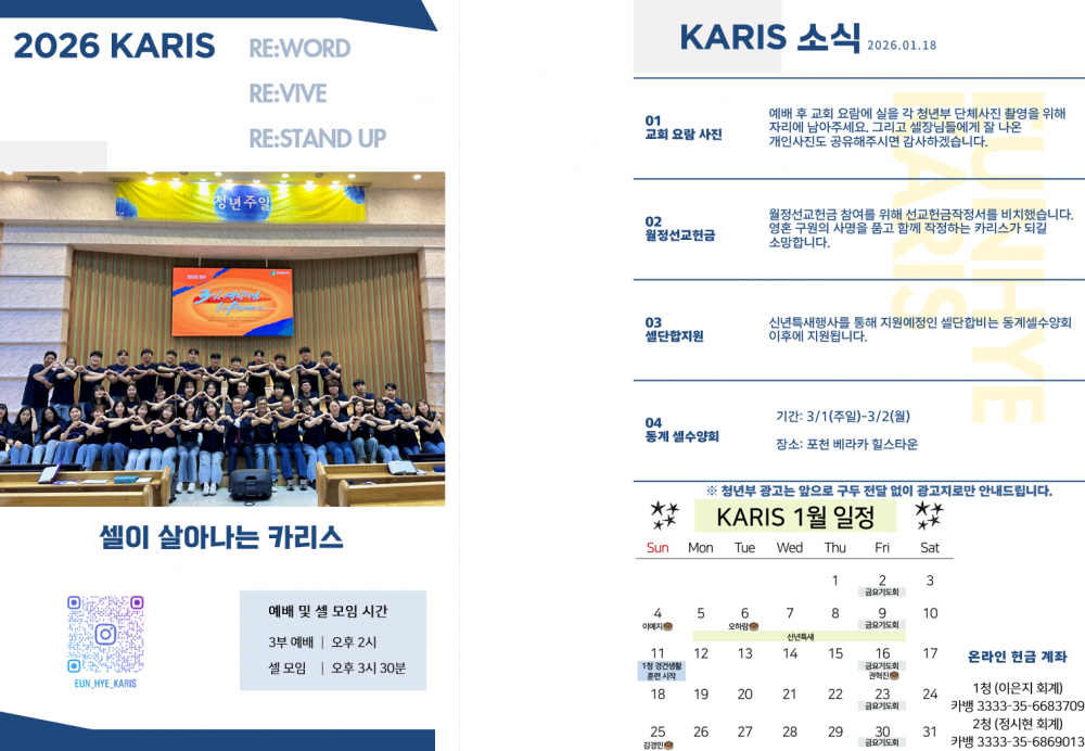 목록 [1청년소식] [카리스 소식] 2026.01.18 소식지 작성자 청년부 작성일 26-01-18 10:37 | 조회 86 | 댓글 0 본문 2026.01.18 카리스 소식 알려드립니다. 이전글다음글 댓글목록 등록된 댓글이 없습니다. 목록